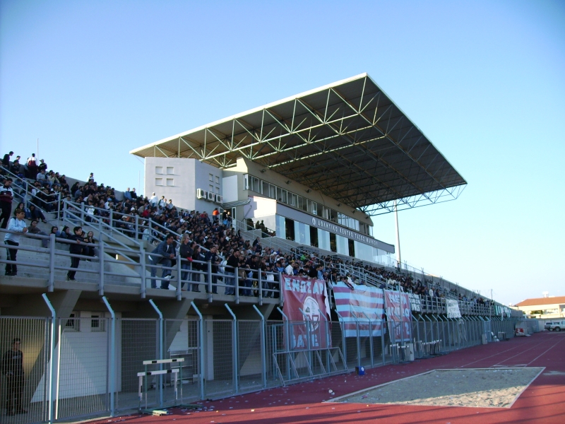 (Stadio Tasos Markou, 35.030893, 33.987420) Zwei Tage nach dem Länderspiel fuhr ich mit dem Fahrrad zu diesem Stadion, und da hing ein Zettel, dass das Spiel auf den 18ten verlegt wurde, na toll. Wenigstens ist das Fahrrad ausleihen im Hotel kostenlos gewesen. Also am nächsten Tag wieder hin und dieses mal war was los, Ticket erworben und rein in die gute Stube !