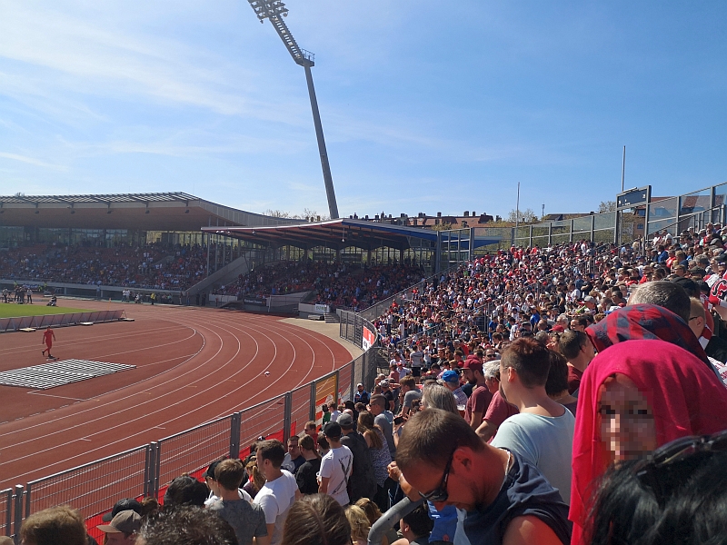(Auestadion, 51.298730, 9.484015) Welch ein Glück das ich noch nie im Auestadion war. Das Stadion wurde 1953 eröffnet und fasst 18.737 Zuschauer. Zweimal fand hier das DFB Pokal Endspiel statt (16.11.1958 Fort. Düsseldorf – VfB Stuttgart 3:4 n.V. & 27.12.1959 SW Essen – Bor. Neunkirchen 5:2). Für das heutige Spiel wurde mächtig die Webetrommel gerührt und das machte sich bezahlt. Satte 15.488 kamen zu diesem Kassler Derby. Normalerweise hat der KSV Hessen zwischen 1500 und 3000 Zuschauer, je nach Gegner eben. Die Hütte war richtig gut voll – Herrlich ! Die Zuschauer mussten sich gedulden um den ersten Treffer zu sehen, erst kurz vor dem Pausenpfiff netzte Ex Profi Mahir Saglik für die Gastgeber ein, das Stadion jubelte lautstark welches es schon länger nicht mehr in dieser Lautstärke vernommen hatte. Nach dem Seitenwechsel traf in der 68. Minute dann Ex Kassler Rolf Sattorov vom Punkt zum 1:1. Es wurde also wieder spannend! Kassel hatte immer wieder gute Chancen, aber traf nicht zwischen die Pfosten. Auch hier musste ein Elfer helfen, den Sebastian Schmeer in der 88. Minute verwandelte. Das wirkte wie ein Todesstoß für die Gäste. In der Nachspielzeit traf dann Jon Mogge zum 3:1 Endstand. Ein tolles Derby mit super Kulisse ! Dank der Anstoßzeit von 15:00 Uhr war an diesem Montag noch das Spiel Schweinfurt gegen Wacker Burghausen möglich.