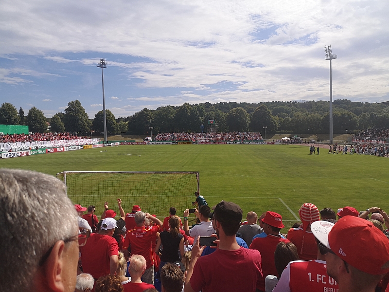 (Friedensstadion, 51.876272, 11.049958) DFB Pokal und ein Ostduell, also nix wie hin. Da wird es sicher voll. Normalerweise fasst das Stadion 5000 Zuschauer, zum Pokal Hit stellte man aber 2 Stahlrohrtribünen hinter die Tore. Das Stadion fest in Unioner Hand die ordentlich Stimmung machten. Die Eisernen taten sich in der 1 Halbzeit schwer und führen nur 1:0, was sich aber in der zweiten Hälfte änderte. Mit einem halben Dutzend wurde die Germania aus dem Pokal geworfen.