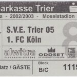 (Moselstadion, 49.768302, 6.647929) Das schöne an der 2 Liga ist ja eigentlich das dort eine gewisse Fluktuation stattfindet. So nun also vom Rhein an die Mosel nach Trier. Das Moselstadion ist ein Leichtathletikstadion welches 1930 eröffnet wurde, damals aber noch „Auf der D’ham“ hieß. In den 12 dunklen Jahren hört es auf den Namen n „Hermann-Göring-Stadion“. In den 60er folgte die Tribüne. Inzwischen spielt die Eintracht 2 Bundesliga – Ausverkaufte Hütte, oder eher ÜBER Ausverkauft! Der Gästeblock war dermaßen überfüllt. Dafür nahm der FC nach einem umkämpften Spiel wenigstens die Punkte mit !